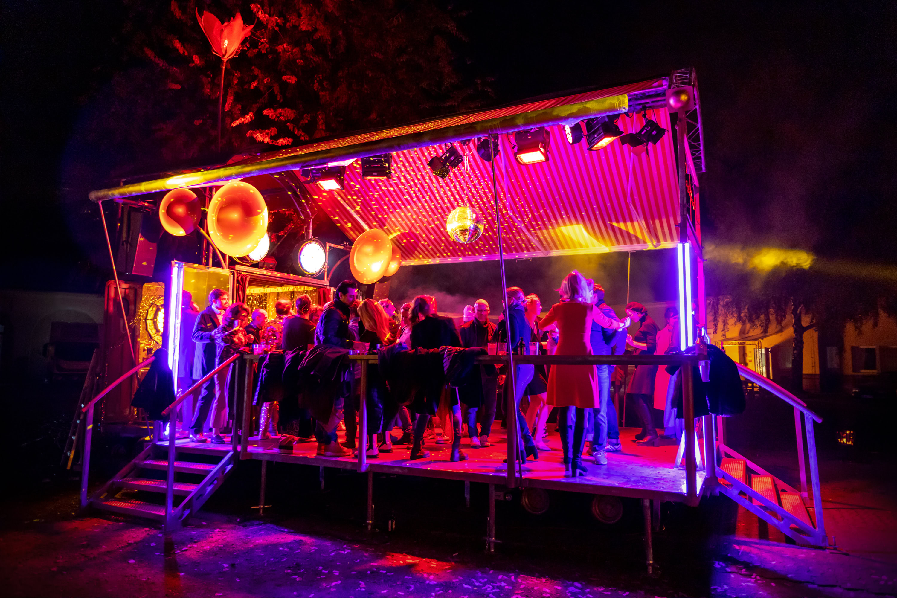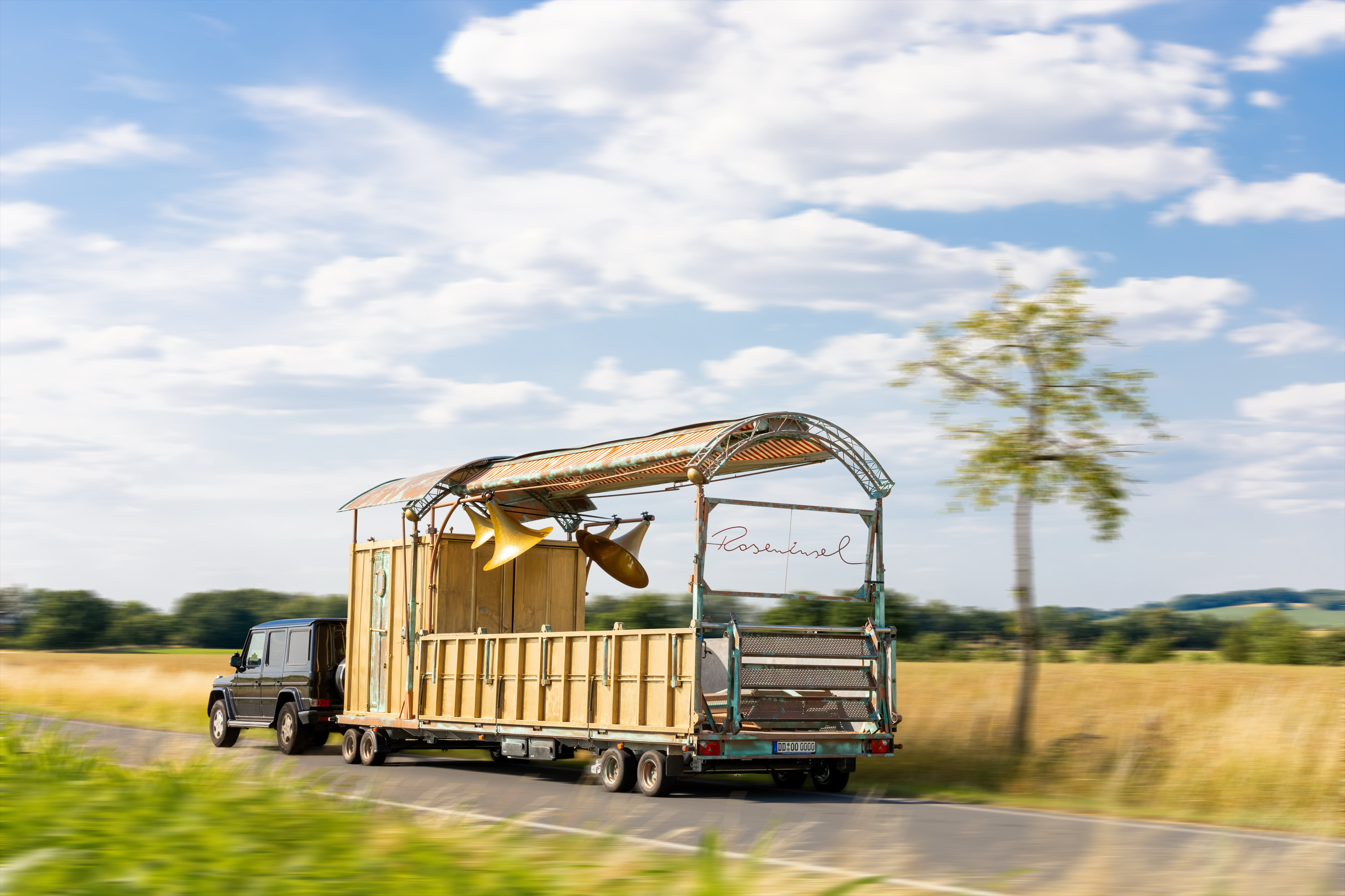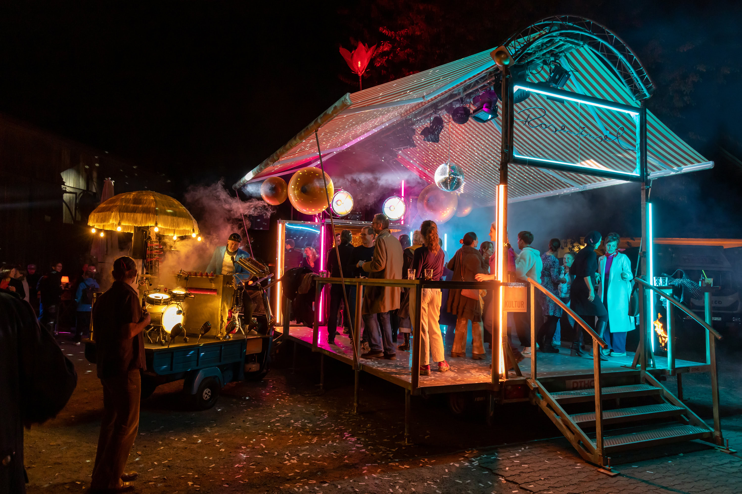 Unsere Roseninsel taucht immer wieder im Meer des Alltäglichen auf und schafft darin beflügelnde Orte. Sie ist eine rollende Bühne mit eigener Technik, ein verzaubernder, mobiler Veranstaltungsort mit Bar, Tanzfläche und ausfahrbarem Dach – flexibel einsetzbar und voll ausgestattet. Mehr über die Roseninsel